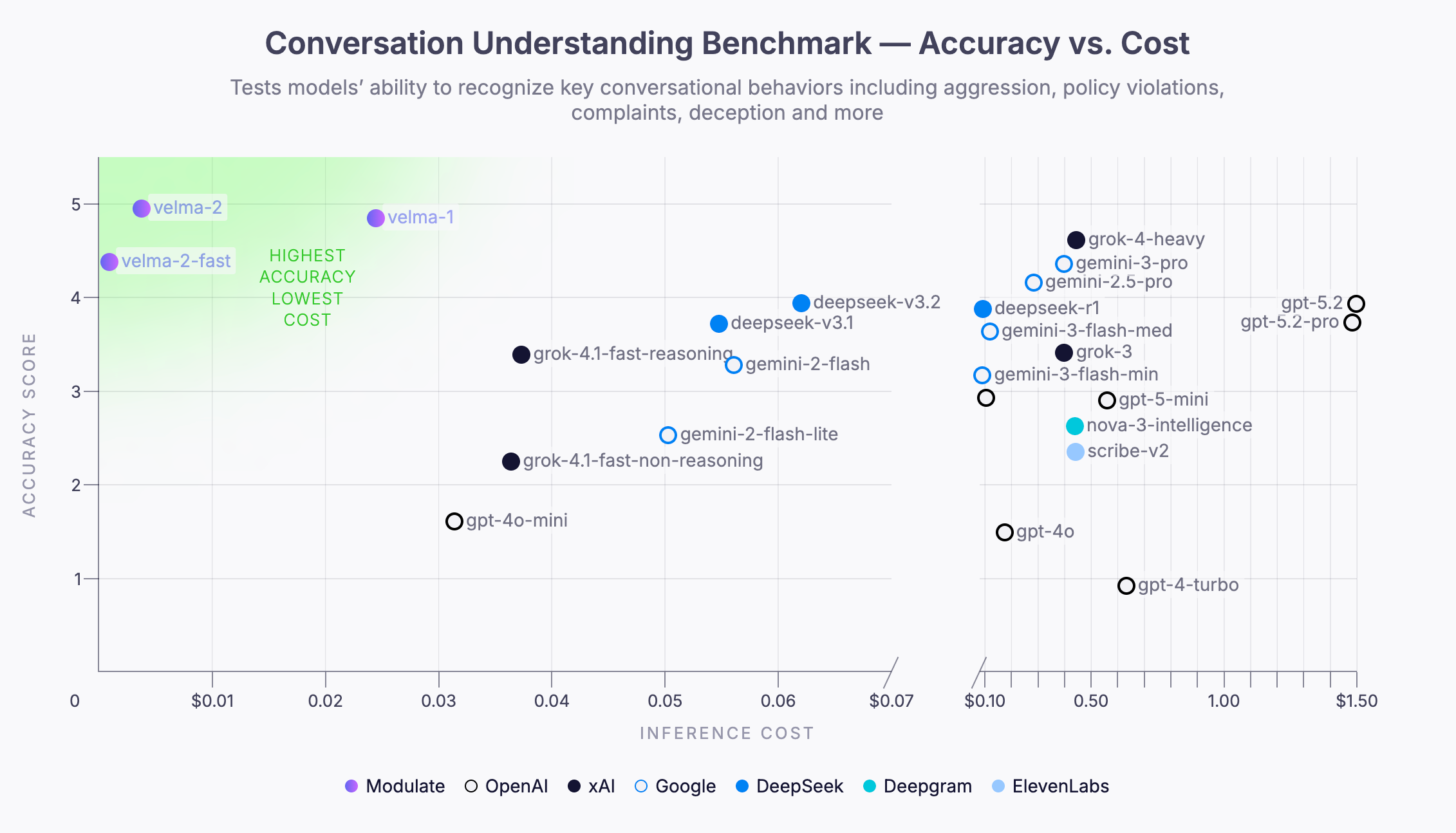 Modulate goes further to demonstrate how its new ELM, called Velma 2.0, outperforms everybody from OpenAI to Gemini to ElevenLabs.